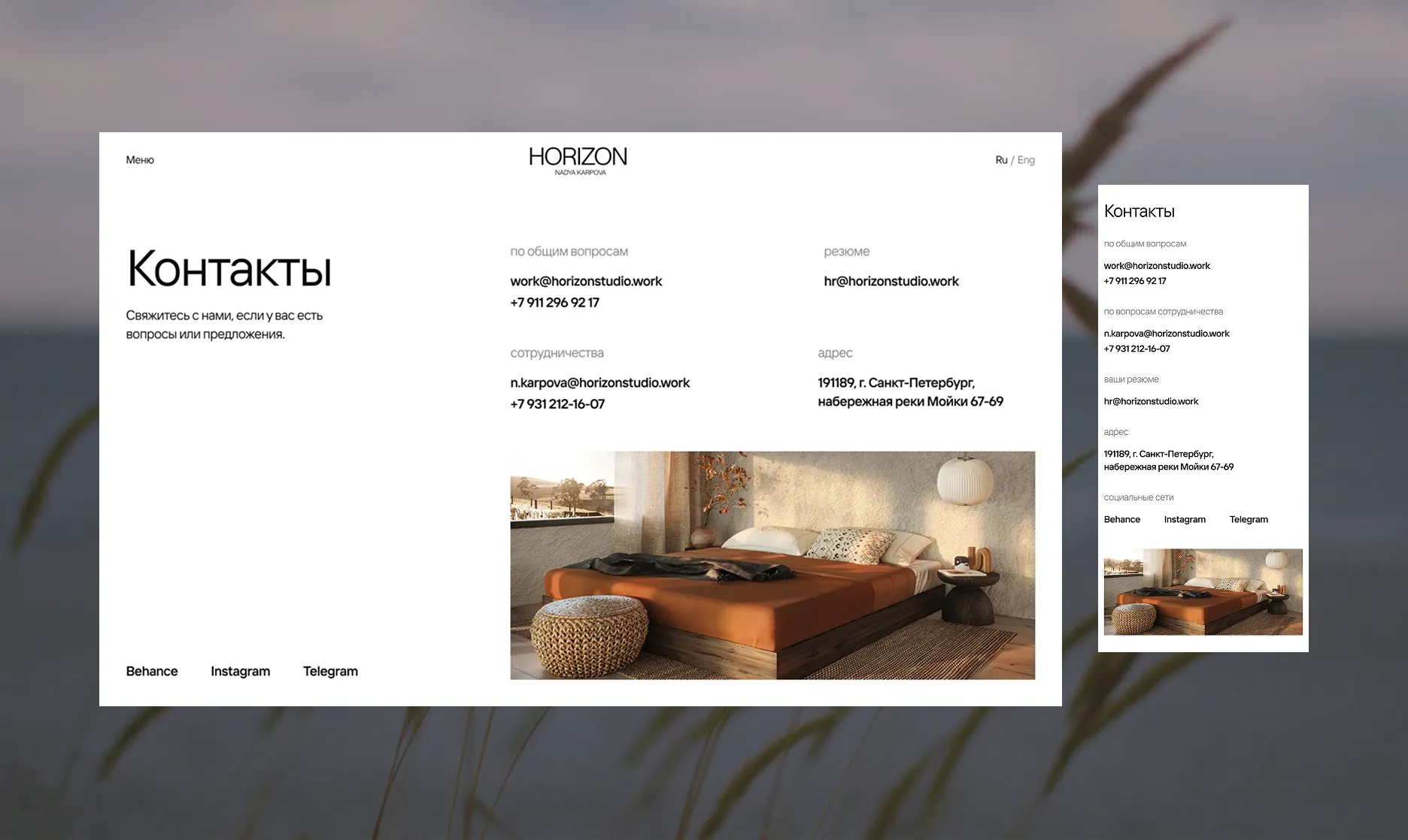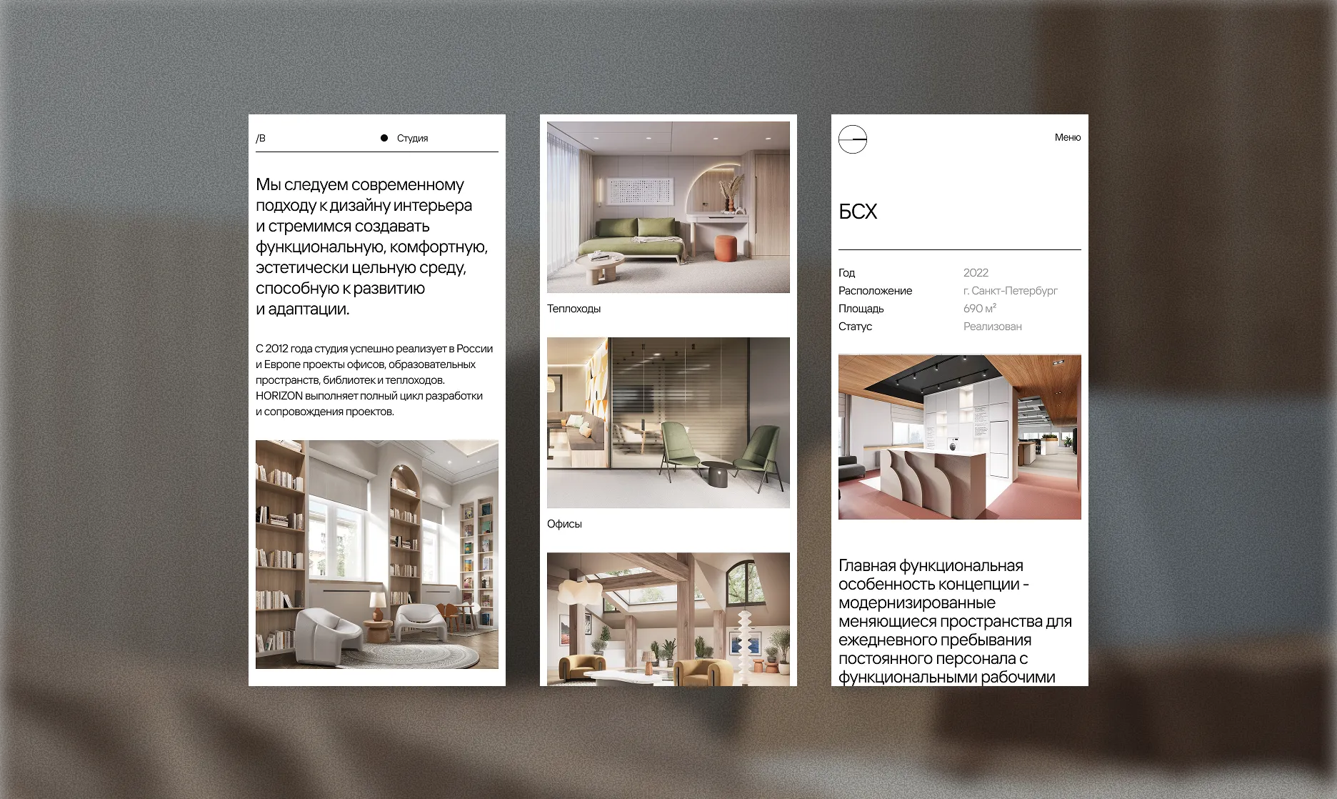 The goal of this project was to design a website for an interior design studio, translating the visual language of its work into a clean, minimal digital experience inspired by Swiss-style layouts. The website’s aesthetic was built to reflect the studio’s own design approach and align with its overall philosophy. A custom portfolio catalog with unconventional filtering and detailed project pages was created to make browsing intuitive and visually engaging, while keeping the main focus on the studio’s projects, imagery, and renderings.